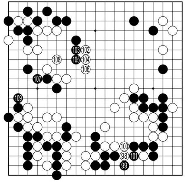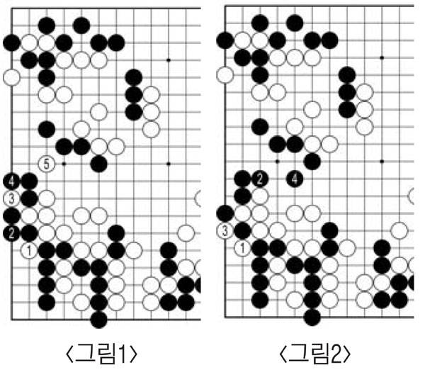 박진솔은 흑107을 얕잡아봤다. <그림1> 백5로 가르면 흑이 온전하지 못할 것이라 생각했다. 곧 그 생각이 짧았음을 알아차렸다. <그림2> 백1, 3은 값이 작고 흑2, 4로 사는 것이 크다는 사실을.