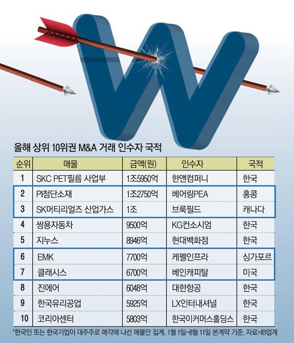 피부·비만 의료기기 전문 기업 클래시스는 올해 4월 최대주주가 창업주 정성재 씨에서 베인캐피탈로 변경됐다. 클래시스는 집속초음파(HIFU) 시술장비 슈링크를 해외 누적 9000대 이상 판매하며 국내외 뷰티 업계에서 주목받은 기업이다. 베인캐피탈은 과거 휴젤 인수·매각으로 5년 만에 5000억원 이상 차익을 낸 경험을 바탕으로 이번 인수에도 6700억원을 썼다. 이 밖에 세계 1위 폴리이미드(PI) 필름 제조 기업 PI첨단소재의 인수 우선협상대상자가 홍콩계 PEF 운용사 베어링PEA로 선정되는 등 올해 M&A시장에선 외국 자본 선전이 두드러졌다.