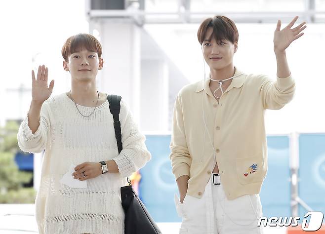(인천공항=뉴스1) 권현진 기자 = 엑소 첸과 카이(오른쪽)가 콘서트 참석차 11일 오후 인천국제공항을 통해 호주 시드니로 출국하기 전 팬과 취재진에게 인사를 하고 있다. 2022.8.11/뉴스1