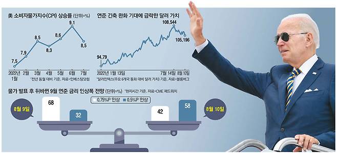 10일(현지시간) 시카고상품거래소(CME) 페드워치에 따르면 연방기금(FF) 금리 선물시장은 연준이 9월 연방공개시장위원회(FOMC) 회의에서 빅스텝(0.5%포인트 금리 인상)을 단행할 확률을 58%로 점치고 있다. 자이언트스텝(0.75%포인트 금리 인상)을 밟을 확률은 42%로 이보다 낮았다. 7월 CPI 발표 전날인 9일만 해도 시장은 자이언트스텝 단행 가능성(68%)에 더 무게를 뒀는데, 하루 만에 시장 전망이 크게 뒤바뀐 것이다.