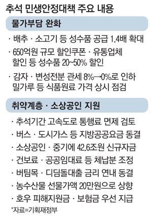 이날 정부는 역대 최대 규모 추석 성수품 공급과 할인쿠폰 지원, 마트 자체 할인 유도 등을 주요 내용으로 담은 추석 민생안정대책을 내놨다. 정부는 이번 대책을 통해 배추·무·사과 등 농산물과 소고기·돼지고기를 비롯한 축산물 같은 20가지 성수품 가격을 1년 전 수준으로 관리하겠다고 윤 대통령에게 보고했다.