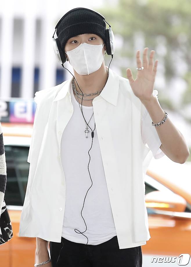 (인천공항=뉴스1) 권현진 기자 = 그룹 피원하모니(P1Harmony) 기호가 콘서트 참석차 11일 오후 인천국제공항을 통해 호주 시드니로 출국하기 전 팬과 취재진에 인사를 하고 있다. 2022.8.11/뉴스1