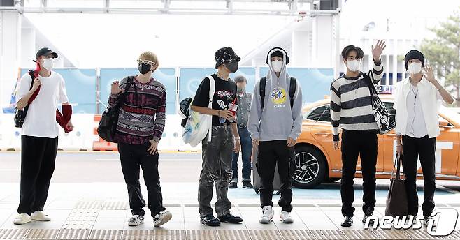 (인천공항=뉴스1) 권현진 기자 = 그룹 피원하모니(P1Harmony)가 콘서트 참석차 11일 오후 인천국제공항을 통해 호주 시드니로 출국하기 전 팬과 취재진에 인사를 하고 있다. 2022.8.11/뉴스1
