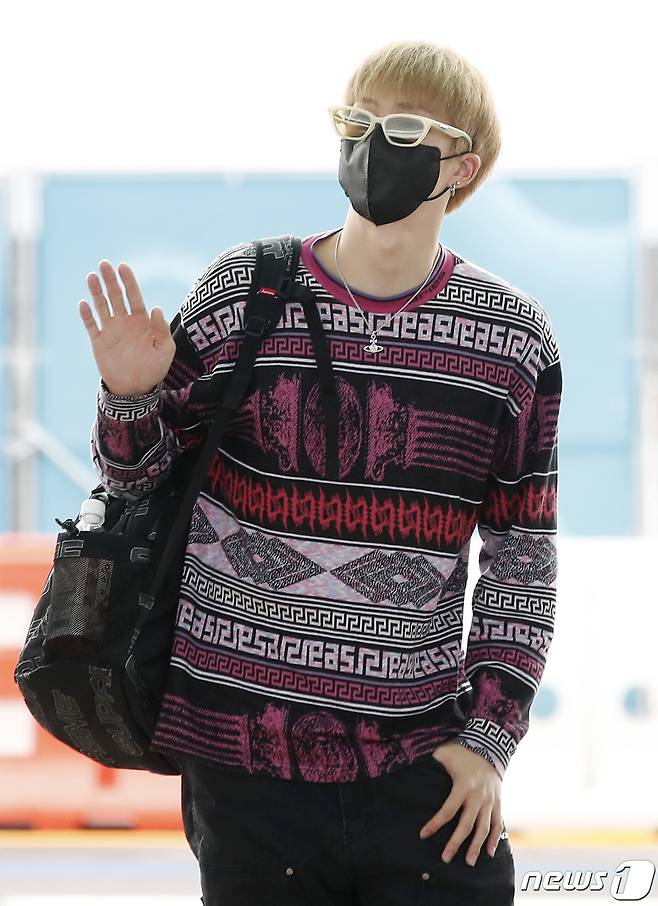 (인천공항=뉴스1) 권현진 기자 = 그룹 피원하모니(P1Harmony) 지웅이 콘서트 참석차 11일 오후 인천국제공항을 통해 호주 시드니로 출국하기 전 팬과 취재진에 인사를 하고 있다. 그의 가방에 왼쪽 포켓에 오미자차가 눈길을 끈다. 2022.8.11/뉴스1