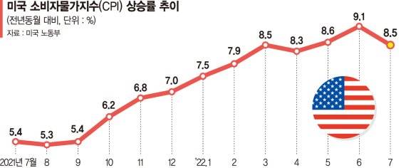 이날 발표된 미국 7월 CPI는 유가 하락에 힘입어 전년동기 대비 8.5% 상승했다. 지난 6월의 9.1% 상승에 비해 하락했으며 기대치 8.7%에 못 미쳤다. 또 전월과 비교해 0%로 제자리를 기록했다. 식료품과 에너지를 제외한 근원CPI는 전월 대비 0.3% 오르면서 5월과 6월 사이의 0.7% 상승과 비교해 떨어졌다.