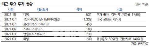 더구나 SLL중앙은 2021년 중 온라인동영상서비스(OTT) 업체 티빙에 총 731억원(유상증자 591억원, 전환사채 140억원)을 투자해 17.3%의 지분을 확보했으며, 향후 티빙향 매출이 증가할 수 있을 것으로 전망된다.
