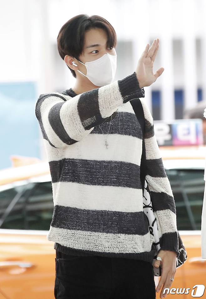 (인천공항=뉴스1) 권현진 기자 = 그룹 피원하모니(P1Harmony) 인탁이 콘서트 참석차 11일 오후 인천국제공항을 통해 호주 시드니로 출국하기 전 팬과 취재진에 인사를 하고 있다. 2022.8.11/뉴스1