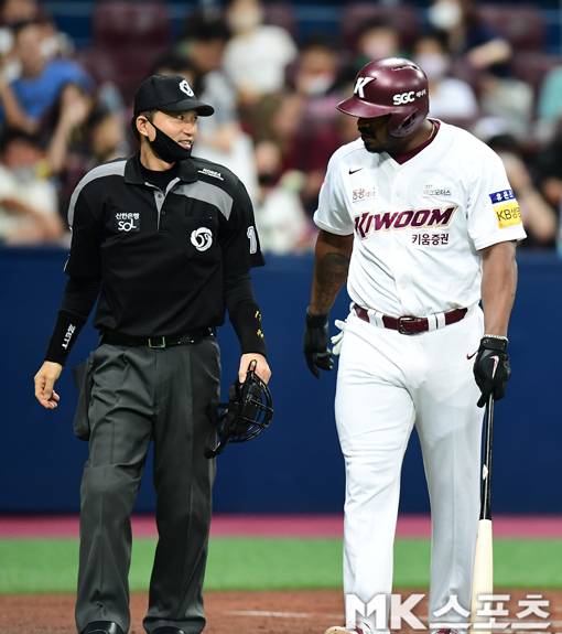 1회 말 2사에서 키움 푸이그가 루킹삼진을 당한 후 오훈규 주심에게 가볍게 어필하고 있다.