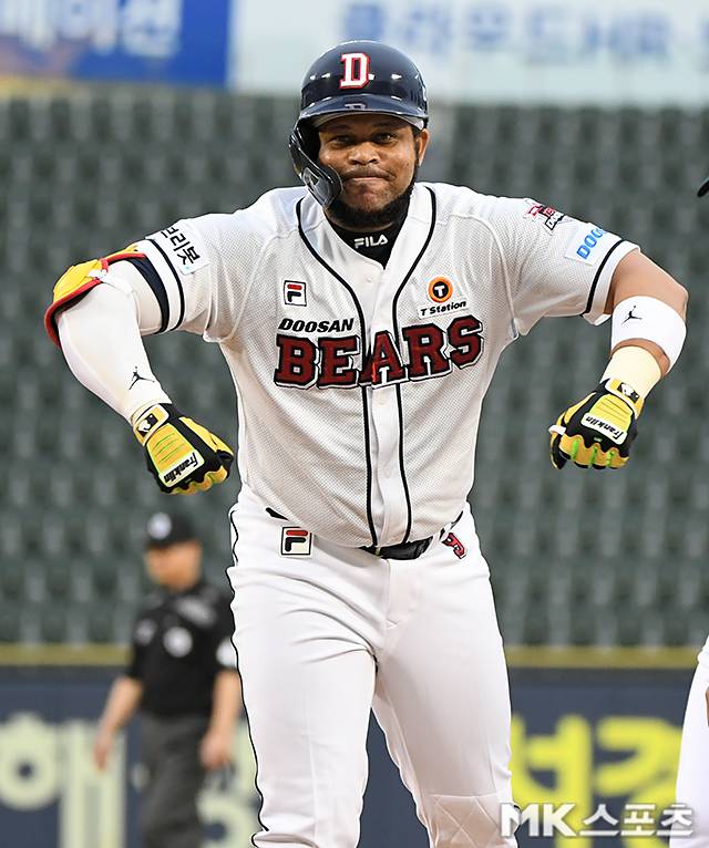 2회말 무사에서 두산 페르난데스가 안타를 친 뒤 기뻐하고 있다.