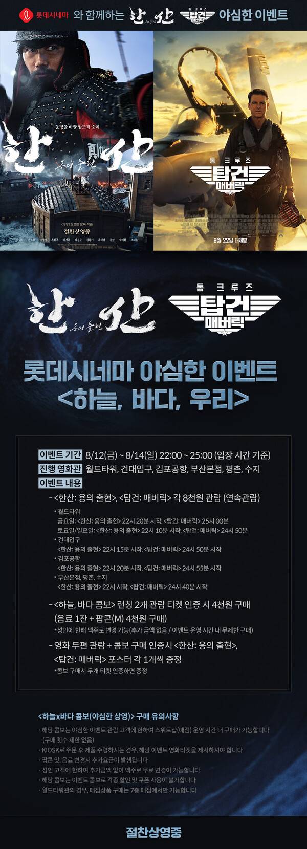 더불어 두 편의 영화 관람 고객 대상으로는 팝콘과 음료를 묶은 콤보를 4천 원에 구매 가능하며 성인에 한하여 음료는 맥주로도 변경이 가능하게 준비하였다. 또한 영화 영화 관람과 콤보 구매를 인증하면 '한산: 용의 출현'과 '탑건: 매버릭' 영화 특별 포스터를 각 1매씩이 제공된다. 이벤트에 관한 자세한 사항은 롯데시네마 홈페이지 및 애플리케이션에서 확인 가능하다.
