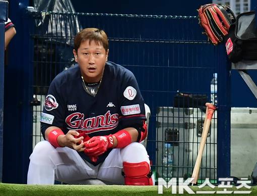 스타팅 라인업에서 빠진 롯데 이대호가 5회 초에서 대타로 나설 준비를 하고 있다.