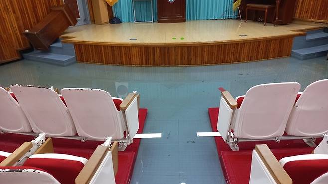 [청주=뉴시스] 안성수 기자 = 11일 충북 청주 동주초등학교 시청각실이 집중호우에 따른 건물 누수로 침수됐다. (사진=충북교육청 제공) 2022.08.11. photo@newsis.com