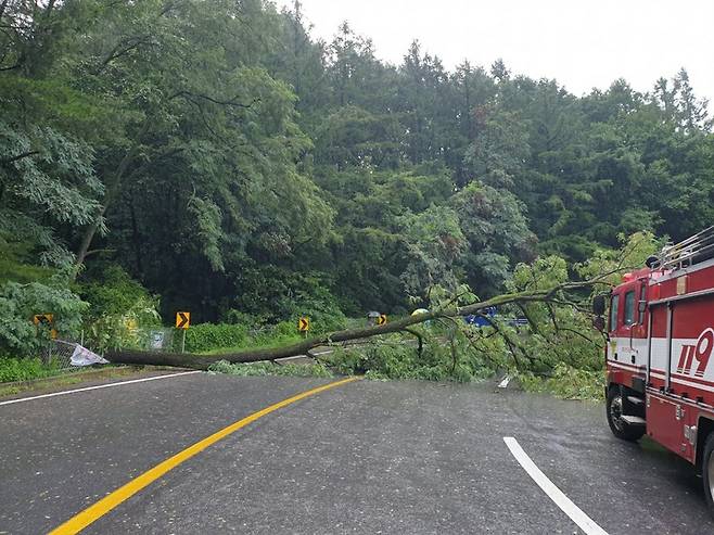 [단양=뉴시스] 안성수 기자 = 11일 단양군 대강면 용부원리 한 도로를 쓰러진 나무가 점거해 소방당국이 제거 작업을 하고 있다. (사진=충북소방본부 제공) 2022.08.11. photo@newsis.com