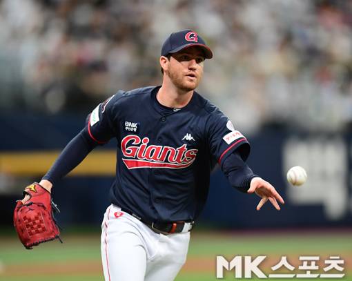 6회 말 1사에서 롯데 반즈가 키움 김준완의 타구를 직접 잡아 아웃카운트를 늘렸다.