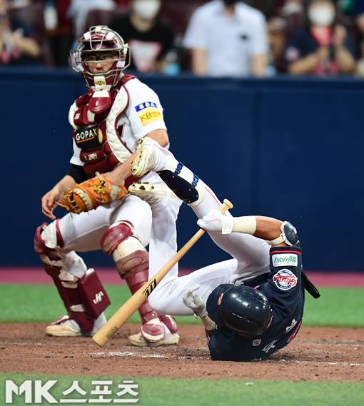 8회 초 무사 1루에서 롯데 장두성이 키움 하영민의 몸쪽 높은 공에 놀라 뒤로 넘어지고 있다.