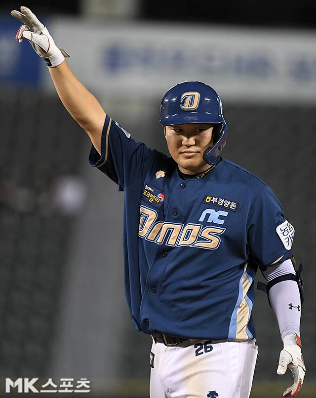 6회초 2사 1루에서 NC 박대온이 안타를 친 뒤 기뻐하고 있다.