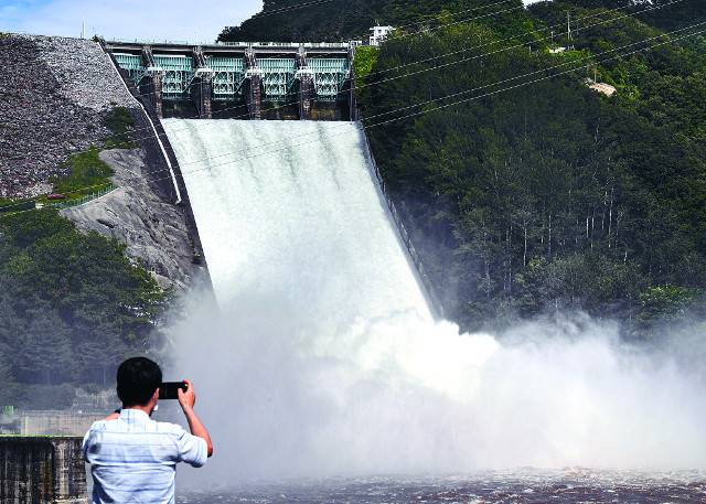 2년 만에 수문을 개방한 강원도 춘천 소양강댐에서 11일 한 시민이 5개 수문에서 쏟아지는 물을 휴대전화로 촬영하고 있다. 한강 수계 댐 중 유일하게 방류를 하지 않았던 소양강댐은 수도권과 강원 지역에 지난 8일부터 쏟아진 호우로 수위가 제한수위(190.3m)에 근접한 189m까지 오르자 이날 오후 3시부터 방류를 시작했다.