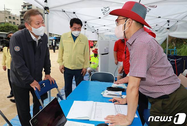 (서울=뉴스1) = 이상민 행정안전부 장관이 11일 오후 서울 관악구 남부초등학교에 마련된 2022 자연재난 피해지역 가전제품 합동수리센터를 찿아 현황 청취 및 관계자들을 격려 하고 있다. (행정안전부 제공)2022.8.11/뉴스1