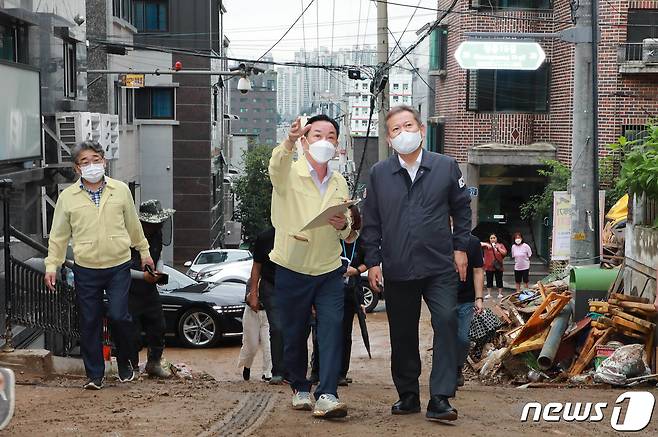 (서울=뉴스1) = 이상민 행정안전부 장관이 11일 오후 서울 관악구 청룡산 산사태 현장을 방문해 수해복구현장을 살펴보고 있다. (행정안전부 제공)2022.8.11/뉴스1