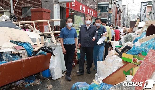 (서울=뉴스1) = 이상민 행정안전부 장관이 11일 오후 서울 관악구 관악신사시장을 방문해 수해복구현장을 살펴보고 주민들 의견을 경청하고 있다. (행정안전부 제공)2022.8.11/뉴스1