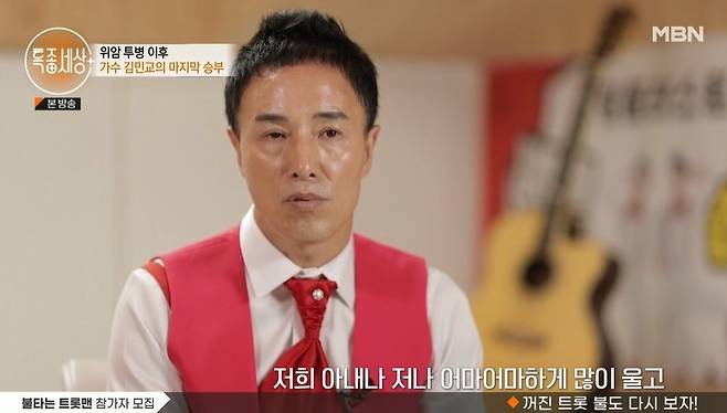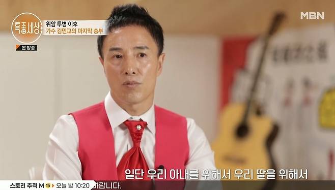 가족의 힘으로 시련을 이겨낸 김민교는 최근 트로트가수 활동 중이다. 지방의 작은 행사도 마다하지 않는다는 그는 “자존심이나 그런 건 전혀 생각도 안 했다. 우리 아내를 위해 우리 딸을 위해 열심히 해야 했다. 그렇기에 금액이 적어도 주기만 한다면 묻지도 따지지도 않고 갔다”며 가장의 책임감을 전했다.