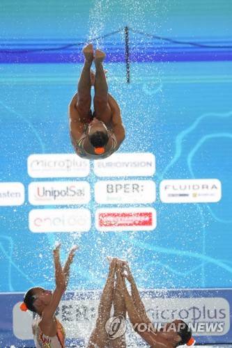 Switzerland team competes in the women's team technical final of artistic swimming at the European swimming championships, in Rome, Thursday, Aug. 11, 2022. (AP Photo/Andrew Medichini)