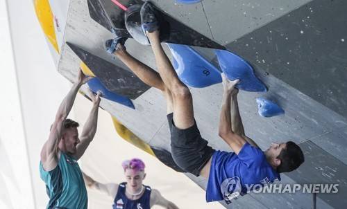 Paul Jenft of France, right, competes with Austria's Jakob Schubert, left, in the men's boulder qualification during the European Sport Climbing Championships in Munich, Germany, Thursday, Aug. 11, 2022. (AP Photo/Martin Meissner)