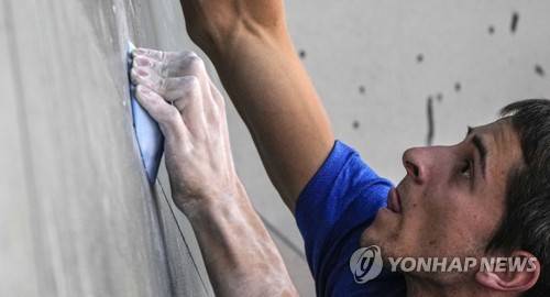 Paul Jenft of France competes during the men's boulder qualification during the European Sport Climbing Championships in Munich, Germany, Thursday, Aug. 11, 2022. (AP Photo/Martin Meissner)