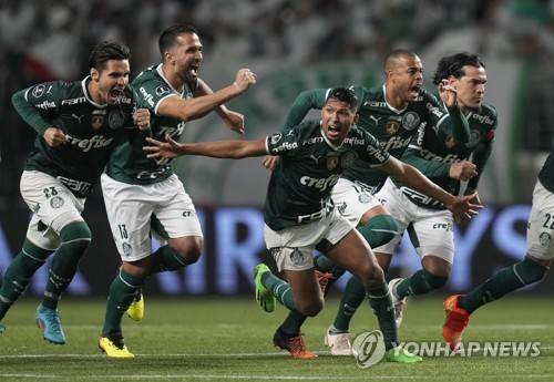 Players of Brazil's Palmeiras celebrate their team's 6-5 win over Brazil's Atletico Mineiro in a penalty shoot-out during a Copa Libertadores quarter final second leg soccer match at Allianz Parque stadium in Sao Paulo, Brazil, Wednesday, Aug. 10, 2022. (AP Photo/Andre Penner)
