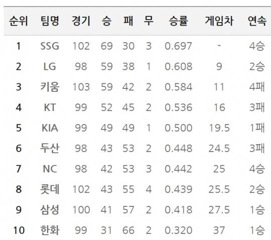 [11일 팀 순위]SSG, 10연속 위닝시리즈로 70승 문턱에..NC는 두산에, 롯데는 키움에 연승으로 5강 희망 이어가