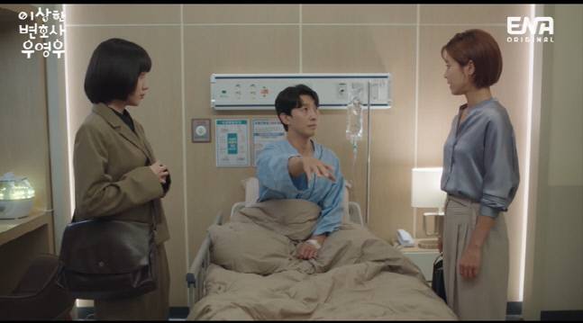 병실에 같이 있던 정명석의 전처 지수(이윤지 분)는 “실례지만 누구세요?”라고 묻는다. 정명석은 “내 전처”라고 소개했고, 우영우는 “전처라면 일만 하고 가정을 돌보지 않던 정명석 변호사님을 8년간 참다가 이혼 통보를 했다는 바로 그 전처”라고 눈치 없이 말했다.