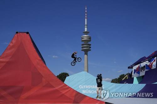 Lara Marie Lessmann of Germany competes in the women's BMX Freestyle Qualification during the European Cycling Championships, with the Olympic TV tower in the background, in Munich, Germany, Thursday, Aug. 11, 2022. (AP Photo/Pavel Golovkin)
