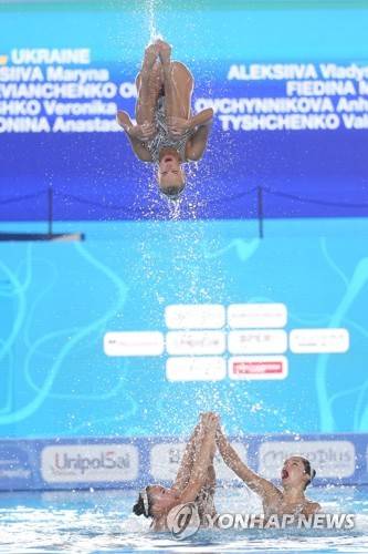Ukrainian team competes in the women's team technical final of artistic swimming at the European swimming championships, in Rome, Thursday, Aug. 11, 2022. (AP Photo/Andrew Medichini)