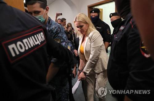 epa10115603 Former Russian state Channel One TV journalist Marina Ovsyannikova is escorted to attend a hearing at the Basmanny district court in Moscow, Russia, 11 August 2022. Ovsyannikova was arrested on 10 August 2022. She is charged with public spreading of deliberately false information about the use of the Russian Armed Forces. Her lawyer wrote on social media that the reason of the criminal case launching was a picket staged by Ovsyannikova on 15 July on Sofiyskaya embankment in Moscow. Former Russian state Channel One TV channel journalist Marina Ovsyannikova pulled international attention after on-air protest 14 March 2022 against the 'special military operation' declared by Russian president, when she had entered Ostankino on-air TV studio with a poster reading 'No War. Stop the war. Don't believe the propaganda. You are being lied to here'. EPA/MAXIM SHIPENKOV