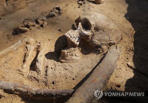 epa10115605 A skeleton found during archaeological excavations in the 14th century settlement called the 'Pompeii of Warmia' near Barczewko village, northern Poland, 11 August 2022. This place is called the 'Pompeii of Warmia' because the ruins of the city destroyed during the invasion are preserved intact. The former town of Alt Wartenburg was located between Lake Wadag and the river Orzechowka, about five kilometres from Barczewo. It was probably inhabited by settlers from Silesia. EPA/Tomasz Waszczuk POLAND OUT