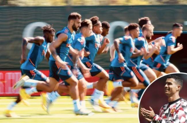 영국 '더 선'은 11일(이하 한국시간) "호날두는 체력 문제로 브라이튼전 벤치에 앉았음에도 불구하고 맨유 훈련에서 여전히 선두주자였다"라면서 맨유의 훈련 사진을 공유했다.