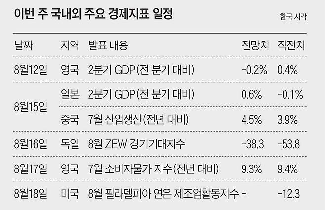 15일엔 일본이 2분기 성장률을 발표한다. 1분기 역성장에 따른 기저 효과 등으로 2분기에는 0.6% 성장이 예상된다. 중국의 7월 산업생산 실적도 같은 날 발표되는데, 코로나 봉쇄를 끝내고 반등 조짐을 보일지가 관심사다.