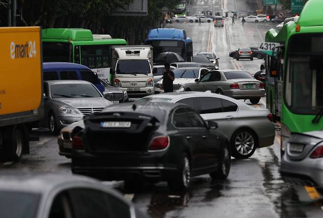 [9일 오전 강남구 대치역 인근 도로에 지난밤 폭우로 침수된 차들이 그대로 방치돼 있다. (서울=연합뉴스)]