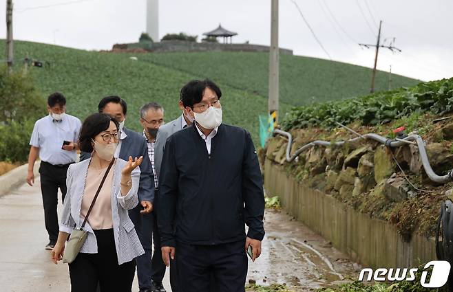 (서울=뉴스1) = 조재호 농촌진흥청장이 11일 강원도 강릉시 고랭지배추 재배지인 안반데기를 방문해 재배현황을 살펴보며 관계관들과 이야기를 나누고 있다. (농촌진흥청 제공)2022.8.11/뉴스1