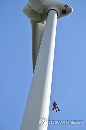 epa10115702 View of a rescue and evacuation exercises of the Polish firefighters at the Wind Farm in Kamiensk, central Poland, 11 August 2022. EPA/Grzegorz Michalowski POLAND OUT