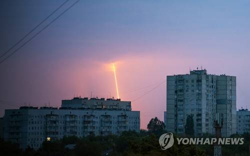 The Russian rocket launch against Ukraine from Russia's Belgorod region is seen at dawn in Kharkiv, Ukraine, Thursday, Aug. 11, 2022. (AP Photo/Vadim Belikov)