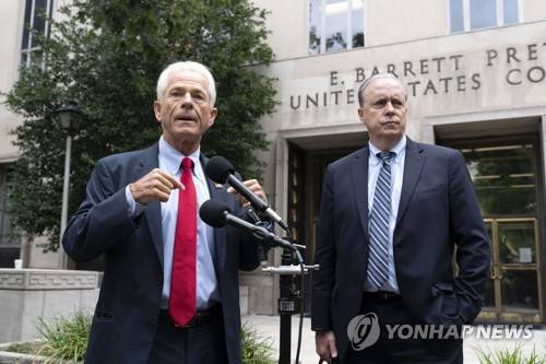 Former Trump White House advisor Peter Navarro, accompanied by his attorney John Rowley, speaks to the media as he leaves federal court in Washington, Thursday, Aug. 11, 2022. (AP Photo/Jose Luis Magana)