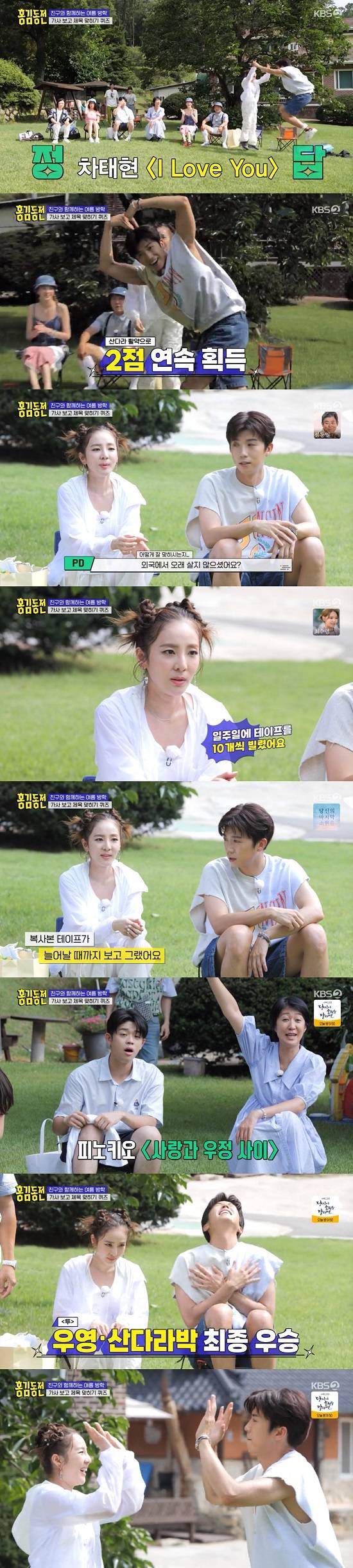 이어 '가사 보고 제목 맞히기 퀴즈'가 이어졌고, 산다라박은 차태현의 'I LOVE YOU' 노래를 맞췄다.- 산다라박은 2문제를 맞추는 모습을 보여 감탄을 자아냈고, PD는 "외국에서 오래 사신 거 아니냐"라며 신기해했다.