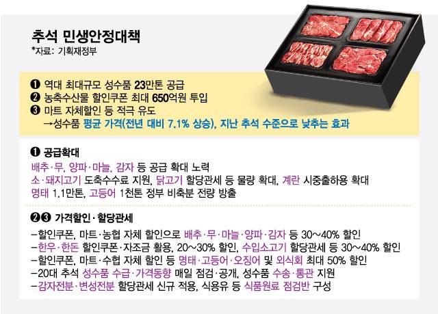 성수품 구매 부담을 직접적으로 낮추기 위한 대책도 포함됐다. 정부는 650억원에 달하는 할인쿠폰을 20대 성수품 중심으로 투입한다. 한 사람이 사용할 수 있는 할인행사별 쿠폰 사용한도는 1만원에서 2만원으로 올린다. 여기에 대형마트의 자체할인까지 맞물리면 농산물은 배추·무 등 채소류 중심으로 최대 40%까지 가격이 떨어질 전망이다. 한우·한돈 등 축산물은 최대 30%, 명태·고등어·오징어 등 수산물은 최대 50%까지 가격이 낮아질 것으로 기대된다.