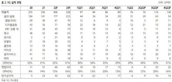 이기훈 하나증권 연구원은 "3분기 블랙핑크·트레져의 동반 컴백 및 4분기 월드·일본 투어가 시작되면서 빅뱅 없이도 사상 최대 실적이 시작될 것"이라며 "2023년 예상 주가수익비율(PER) 기준 여전히 22배에 불과해 블랙핑크 컴백 전까지는 기대감을 계속 높일 필요가 있다"고 조언했다.