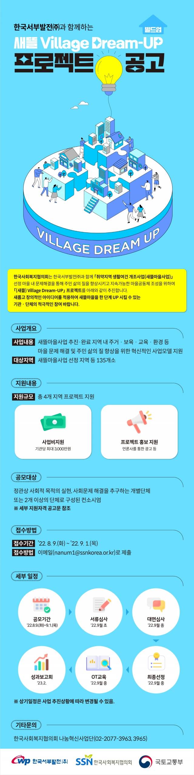 한국서부발전(사장 박형덕, 이하 서부발전), 한국사회복지협의회(회장 서상목, 이하 사회복지협), 국토교통부(장관 원희룡, 이하 국토부)는 국토부가 추진하고 있는 도시 새뜰마을사업 선정 지역 등을 대상으로 주거·보육·교육·환경 등 마을 문제 해결 및 주민 삶의 질 향상을 위한 혁신적 사업모델을 지원하는 '새뜰 Village Dream-UP(새뜰 빌리지 드림업)' 프로젝트를 공모한다고 12일 밝혔다.