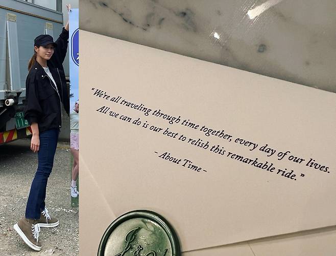 사진 속에는 "We're all traveling through time together, every day of our lives All we can do is do our best to relish this remarkable ride.(우리는 모두 함께 삶이라는 시간을 여행한다. 우리가 할수 있는 최선은 이 멋진 여행을 즐기는 것 뿐이다)"라는 글귀가 적혀져 있다.