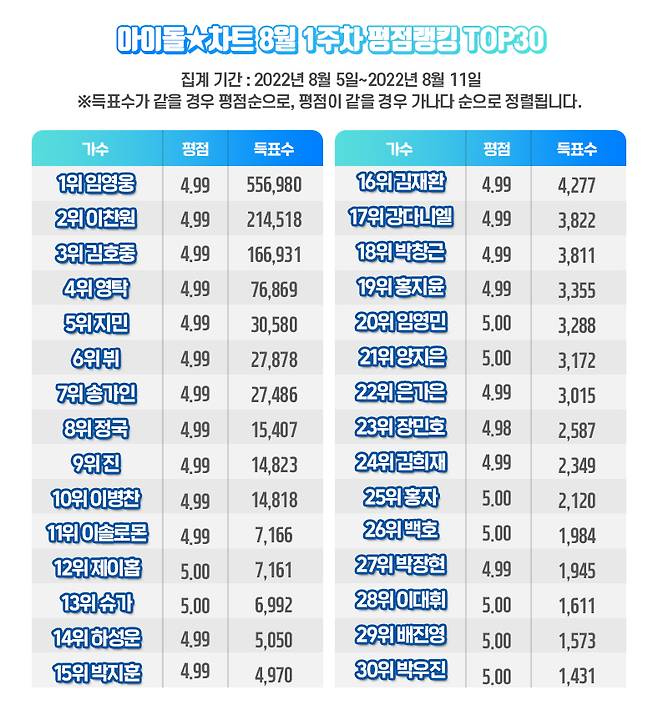 아이돌차트에 따르면 지난 8월 5일부터 8월 11일까지 집계된 평점랭킹에서 임영웅은 55만 6980표를 얻어 최다득표를 기록했다.