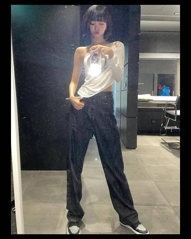 평소 패션에 관심이 많아 인스타 피드에 다양한 룩을 선보이는 르세라핌의 채원(a.k.a.채채)! 채채는 한 쪽 어깨가 과감히 컷팅 된 원 숄더 톱으로 시원한 룩을 완성했다. 거기에 한쪽 눈을 찡그려 장꾸 표정으로 거울 셀카 완성!
