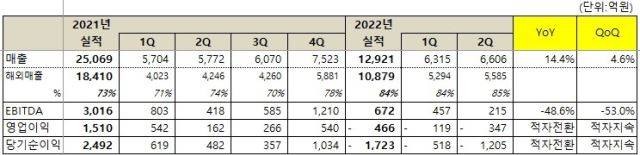 2022년 상반기 누적 기준으로는 매출 1조 2921억원, 영업손실 466억원, 당기순손실 1723억원이다.